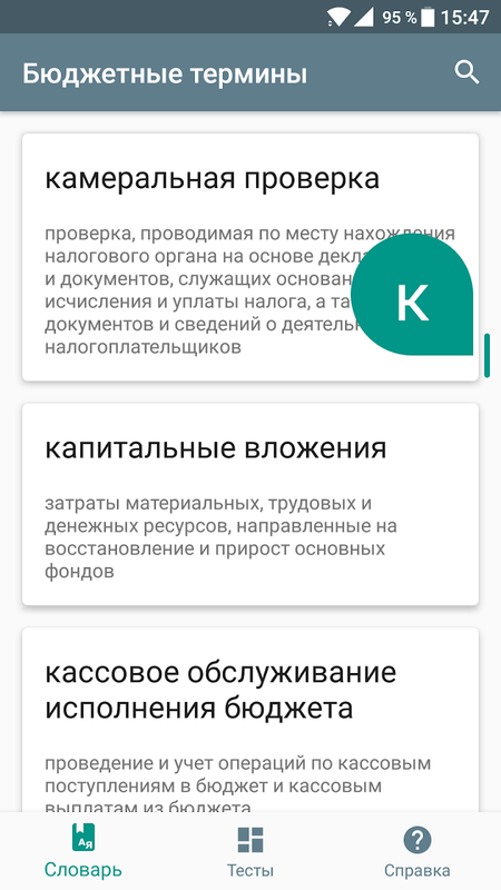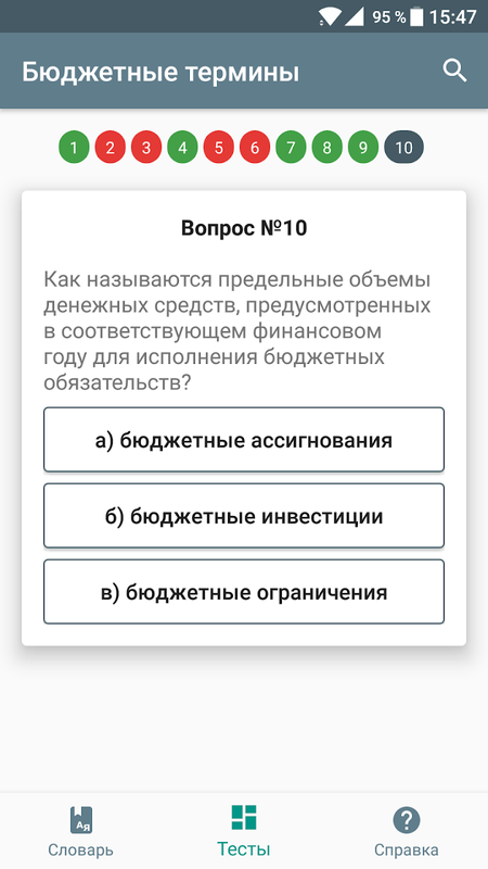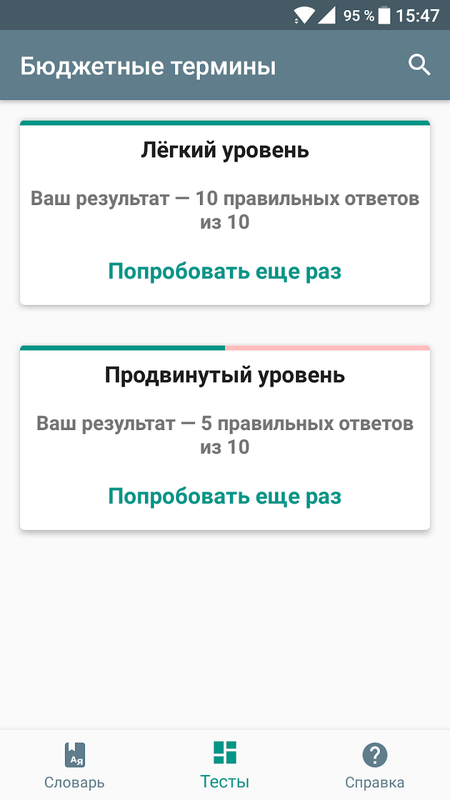 Благодаря второму разделу приложения («Тесты») пользователь имеет возможность проверить свои знания бюджетных терминов. Стоит отметить, что выбор неправильного варианта ответа сопровождается кратким разъяснением того, почему данный ответ является неверным. На сегодняшний день имеется два уровня сложности.