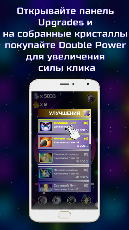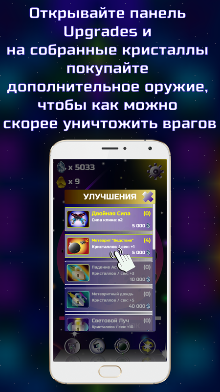 - На собранные кристаллы открывайте панель с апгрейдами и покупайте Double Power для увеличения силы клика, а также дополнительное оружие, чтобы как можно скорее уничтожить врагов: вражеских космических пришельцев, инопланетян и астероидов.