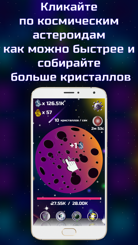 - Кликайте по космическим пришельцам, инопланетянам, планетам и астероидам как можно быстрее и собирайте больше кристаллов.