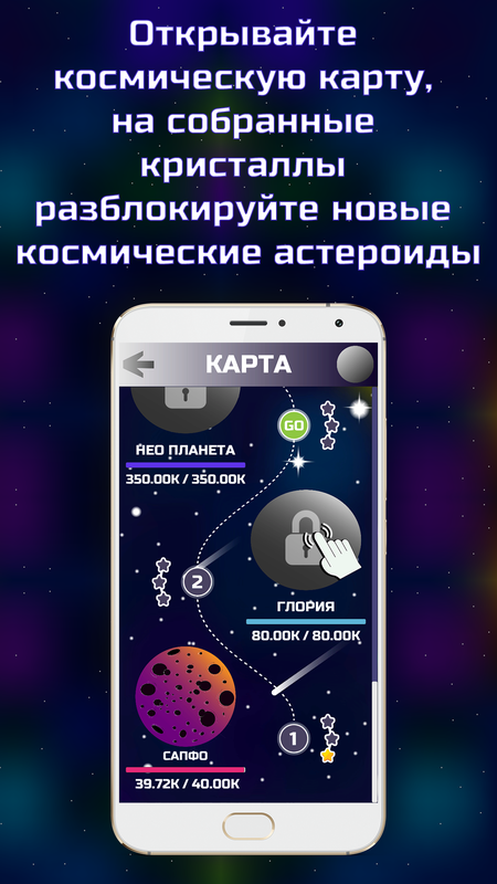 - Открывайте космическую карту, на собранные кристаллы разблокируйте новые космические астероиды и планеты.