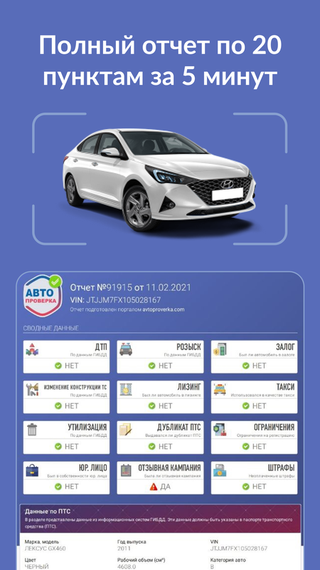 Посмотреть отчет можно прямо в приложении или получить на электронную почту. Все отчеты сохраняются в истории приложения. Приложение проверяет информацию об автомобилях по всей территории РФ.