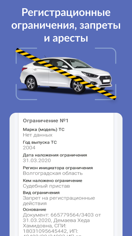 Мы объединили в приложении множество официальных баз данных, такие как база ГИБДД МВД РФ, ФССП, ГТО, ЕАИСТО, РСА, Нотариальная палата, Реестр такси и другие источники.