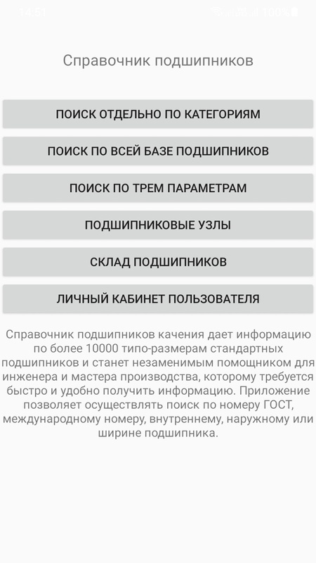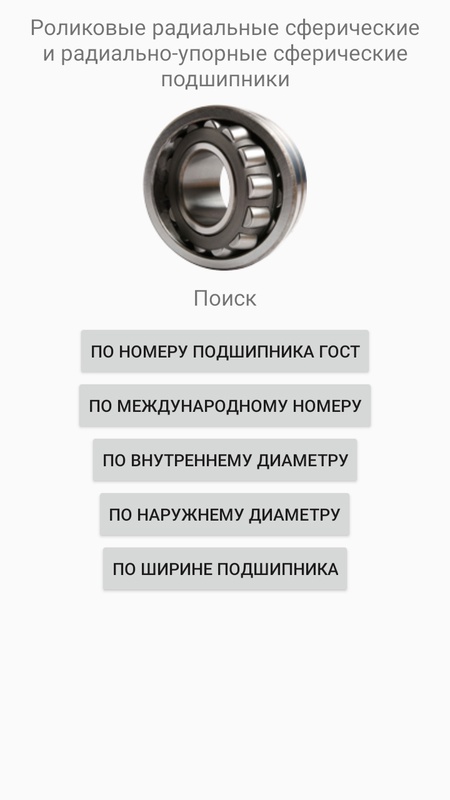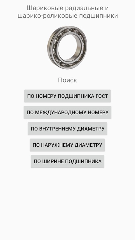Справочник подшипников качения дает информацию по более 10000 типо-размерам стандартных подшипников и станет незаменимым помощником для инженера и мастера производства, которому требуется быстро и удобно получить информацию. Приложение позволяет осуществлять поиск по номеру ГОСТ, международному номеру, внутреннему, наружному или ширине подшипника.