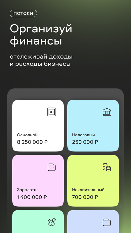 — Система потоков, которая позволяет автоматически распределять деньги и откладывать на необходимые траты. Например, можно настроить автопополнение потока «Налоговый»: отправлять процент с каждого поступления или нужную сумму раз в день, неделю или месяц