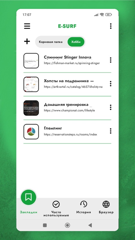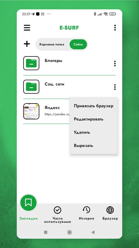 Использовать собственный встроенный браузер E-Surf для поиска и работы с сайтами.