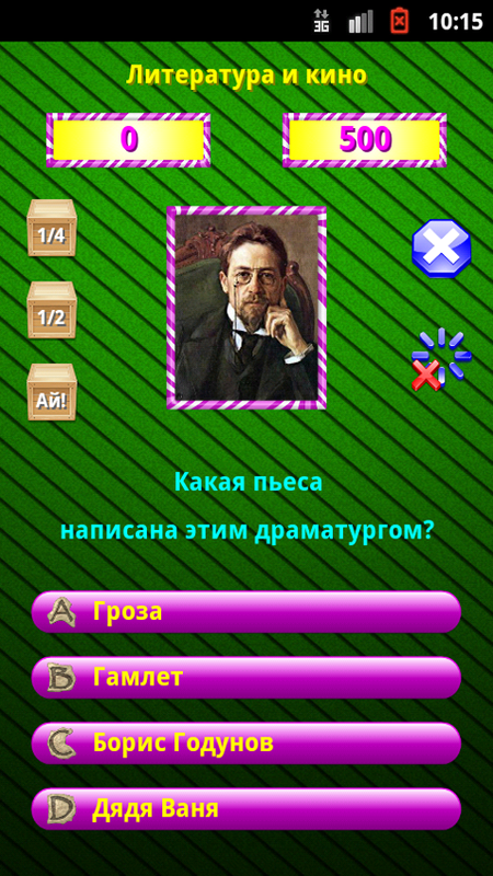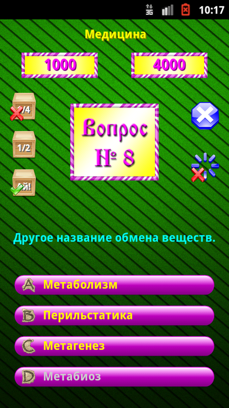 Чтобы выиграть в очередном кону 1.000.000, Вы должны ответить на 15 вопросов и ни разу не ошибиться. База данных последней версии содержит 10.000 вопросов. Все вопросы разбиты на 10 категорий: Математика и компьютеры, Астрономия и космонавтика, Физика и химия, География, Литература и кино, Музыка, Медицина, История, Религия и мифология и Разное. Кроме того, игра содержит медиа-базу из 500-т вопросов, каждый из которых включает либо какое-то изображение, либо звуковой или музыкальный фрагмент. После сыгранной серии игр имеется возможность отослать свой счет на игровой сервер, так что любители этой игры по всему миру могут соревноваться между собой. Имеется возможность создавать свой аккаунт на нашем сервере и играть из-под своего аккаунта на рейтинг с любого PC и с любого Андроид-гаджета. Для полноценной работы игр гаджет должен быть подключен к интернету!