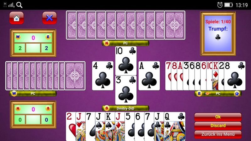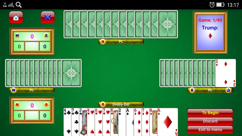 Интеллектуальная карточная игра для четырёх игроков, очень похожая на Винт и Бридж. Достойный интеллект компьютерных игроков, неплохой дизайн, возможность менять колоды карт (7 колод) и цвет рубашек, звуковое сопровождение, оригинальное сохранение результатов игр. После сыгранной серии игр имеется возможность отослать свой счет на игровой сервер, так что любители этой игры по всему миру могут соревноваться между собой. Имеется возможность создавать свой аккаунт на нашем сервере и играть из-под своего аккаунта на рейтинг с любого PC и с любого Андроид-гаджета. Для полноценной работы игр гаджет должен быть подключен к интернету!
