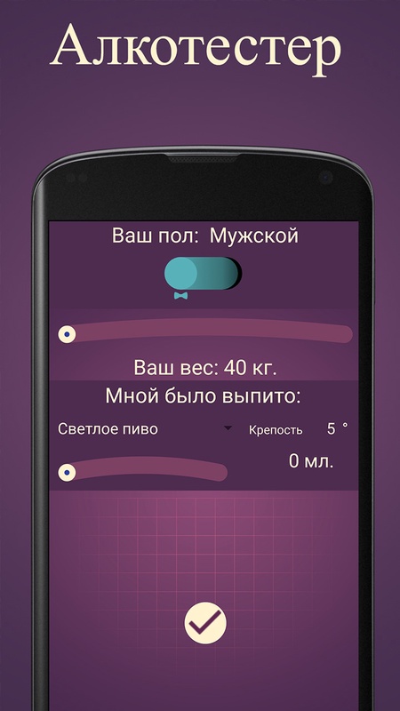 Используйте Алкотестер, приложение для определения уровня алкоголя в крови только с осознанием того, что алкоголь вредит вашему здоровью. Не садитесь за руль в состоянии алкогольного опьянения.