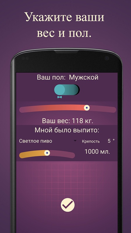 Просто укажите вес, пол, вид и количество выпитого алкоголя и узнаете сколько промилле алкоголя у вас в крови.