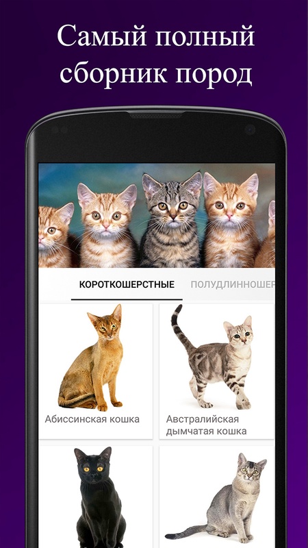 В приложении Породы кошек информация о всех известных породах домашних кошек. По каждой породе кошки фотография породы кошек, вы узнаете об особенностях и повадках представителей разных пород. Подробное описание, происхождение, места обитания, требования к условиям содержания и уходу, характеристики пород и другая полезная информация.