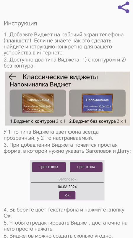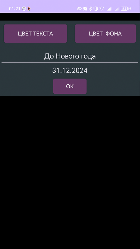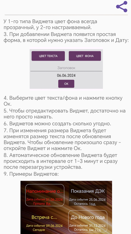 Виджет на экран телефона для отображения простых напоминаний с отображением даты до/после наступившего события. Например, покажет сколько дней осталось до Нового года или сколько вам лет с даты рождения. Добавлять можно любое кол-во Виджетов, редактировать простым нажатием на него. Доступно два типа оформления Виджета.