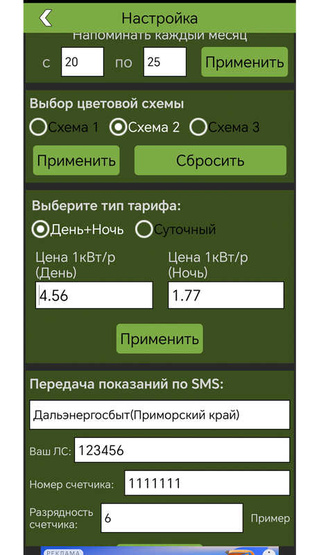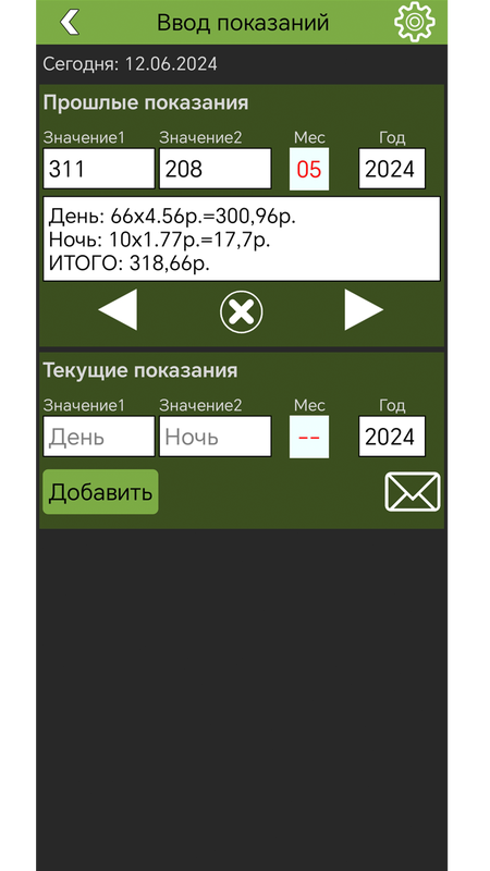 В приложении можно вносить данные по однотарифному счетчику (Суточный) или двух-тарифный (День-Ночь). .