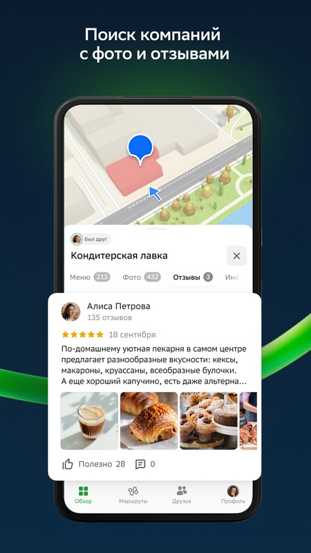 Отзывы. Помогают не только находить компании, товары и услуги, но и выбирать лучшие! В приложении собраны десятки тысяч отзывов, реальные фото от клиентов и показан честный рейтинг места.