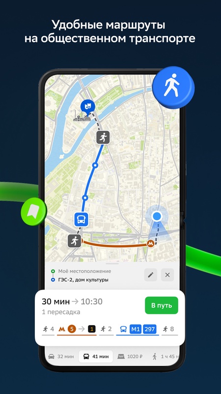 Общественный транспорт. Навигатор построит маршруты на метро, автобусе, маршрутке, троллейбусе, трамвае и электричке. Выбирайте кратчайшие или самые удобные. Включите отслеживание автобусов на карте в реальном времени. Ориентируйтесь на расписание, — включая расписание электричек, — и смотрите на реалистичный прогноз прибытия автобуса к остановке. Точные схемы метро Москвы, Санк-Петербурга и других городов.