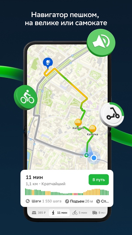Навигатор для пешехода, велосипеда и самоката с точным GPS и ГЛОНАСС. 2ГИС умеет строить маршруты по городу с учётом уклона и набора высоты, велодорожек и лестниц.