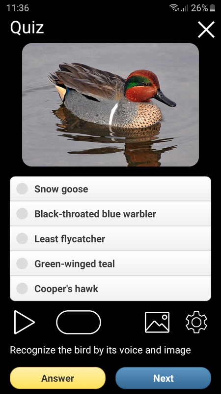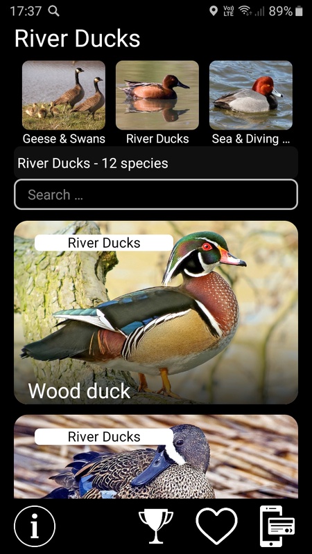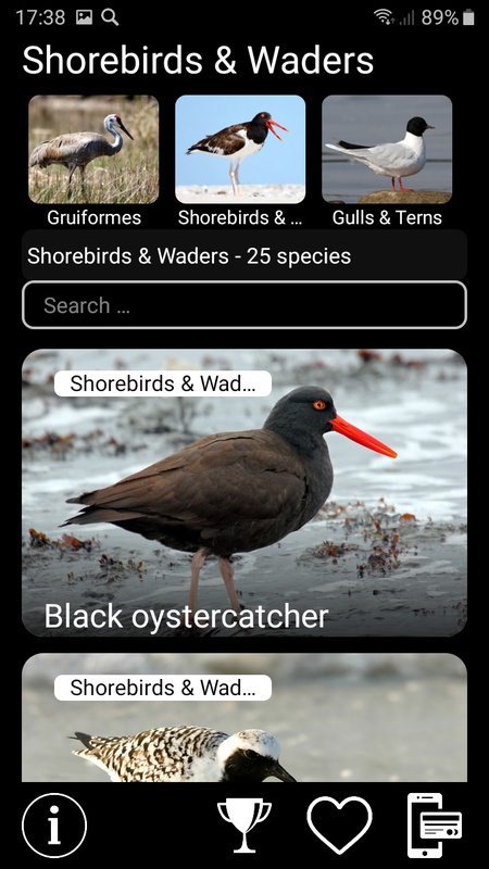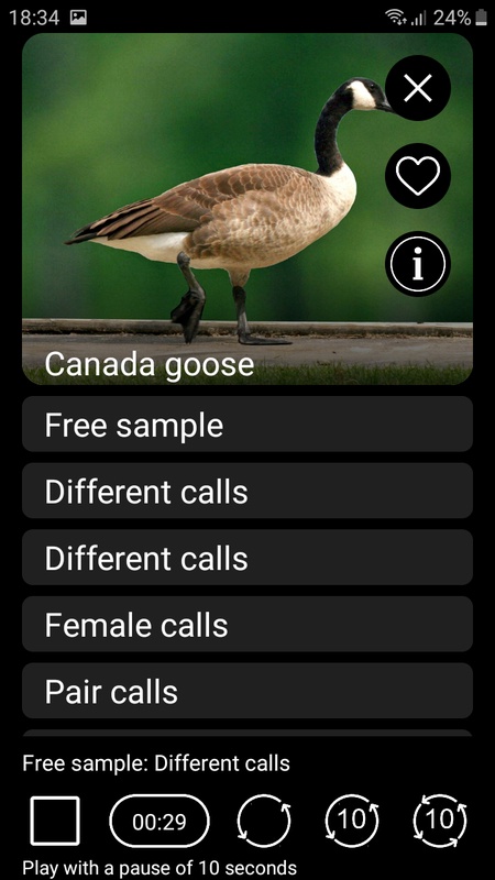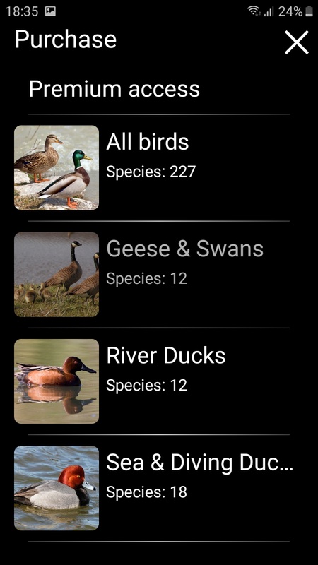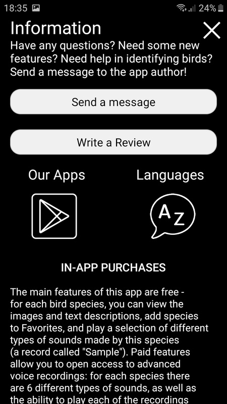 The main features of this app are free - for each bird species, you can view the images and text descriptions, add species to Favorites, and play a selection of different types of sounds made by this species (a record called "Sample"). Paid features allow you to open access to advanced voice recordings: for each species there are 6 different types of sounds, as well as the ability to play each of the recordings in four different ways. You can buy all bird species (group "All Birds"), as well as any of systematic and ecological groups of birds.