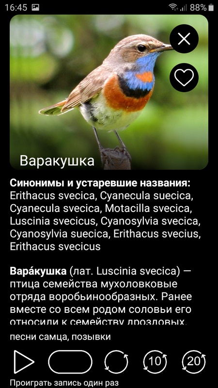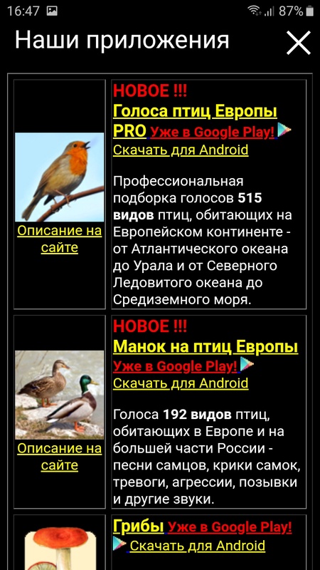 ПРИЛОЖЕНИЕ СОДЕРЖИТ записи голосов 680 видов птиц, распространенных на территории Северной Евразии - от Восточной Европы до Дальнего Востока и от Северного Ледовитого океана до Кавказа, Средней Азии и Китая. Список видов птиц, включенных в приложение, можно посмотреть на нашем сайте: http://ecosystema.ru/04materials/guides/mob/and/18golosa_ru.htm