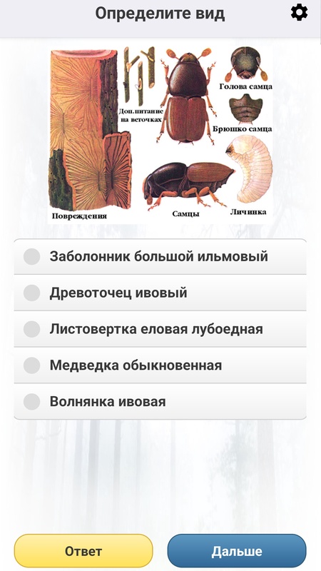 Неограниченное число вопросов на узнавание насекомых и их повреждений по внешнему виду! Играть можно многократно – вопросы на знание видов чередуются в случайном порядке и ни разу не повторяются! Также можно настраивать сложность Викторины, на каждом этапе есть возможность узнать правильный ответ!