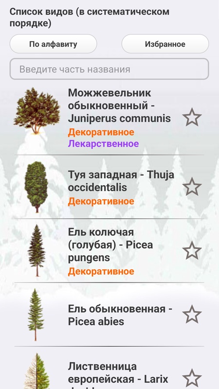 Список видов, включенных в приложение, можно посмотреть здесь http://ecosystema.ru/04materials/guides/mob/and/05trees_win.htm
