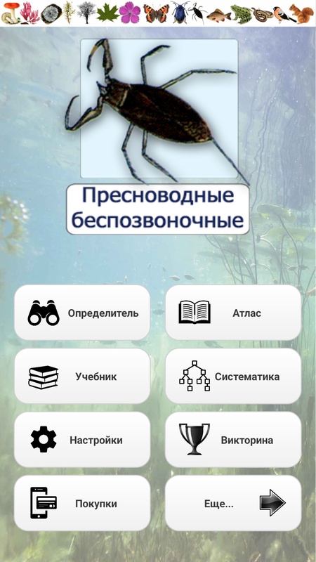 Возьми с собой на водоём (реку, ручей, пруд, озеро, водохранилище), на рыбалку, на дачу, в поход, в экспедицию, в летний лагерь — определяй водных беспозвоночных животных по внешнему виду личинок (нимф) или взрослых особей (имаго)! Незаменимый справочный и образовательный ресурс для школьников, студентов, учителей, педагогов дополнительного образования, специалистов экологического образования и просвещения, организаторов детских экологических лагерей и полевых практикумов, для родителей с детьми и всех любителей природы!
