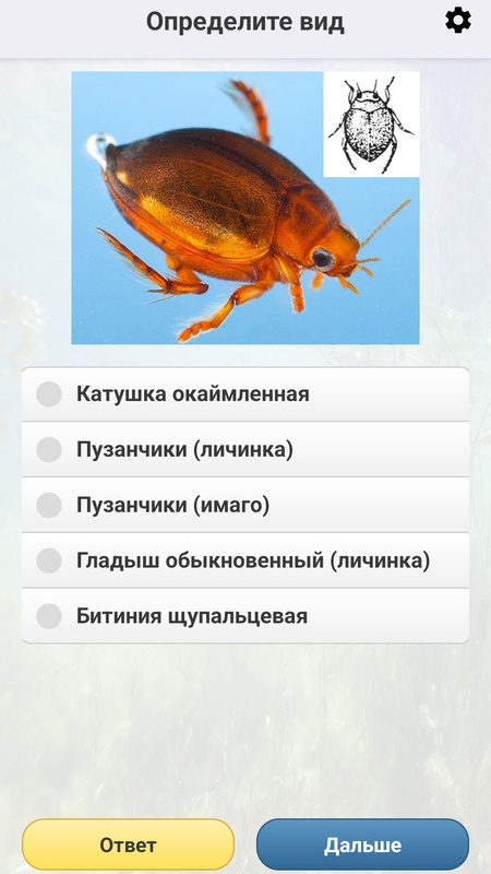 Неограниченное число вопросов на определение пресноводных беспозвоночных по внешнему виду! «Играть в викторину» можно многократно — вопросы на знание видов чередуются в случайном порядке и ни разу не повторяются! На каждом этапе есть возможность узнать правильный ответ! Также можно настраивать сложность Викторины.