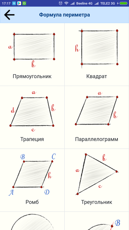 В разделе «Периметр» приведены формулы для следующих фигур: