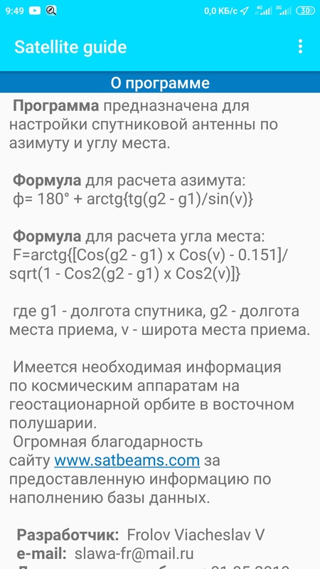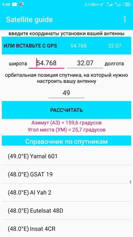 Имеется возможность расчета наведения приемной спутниковой антенны.