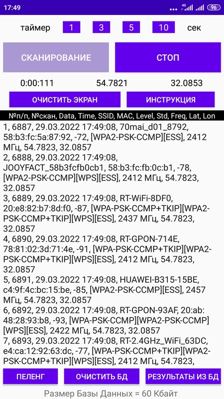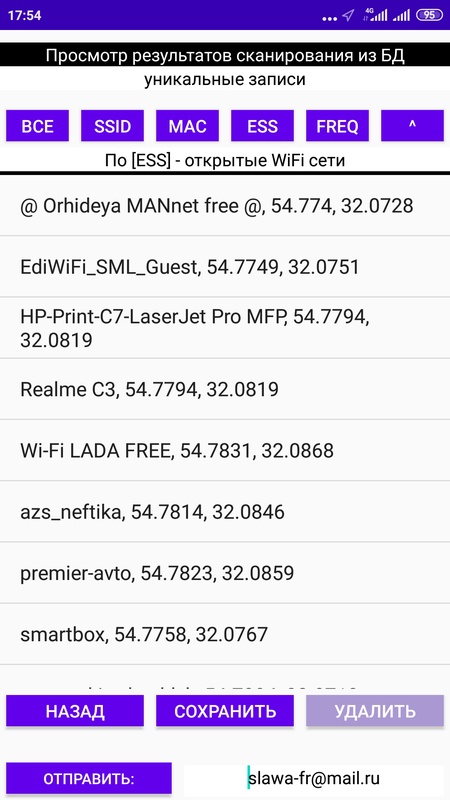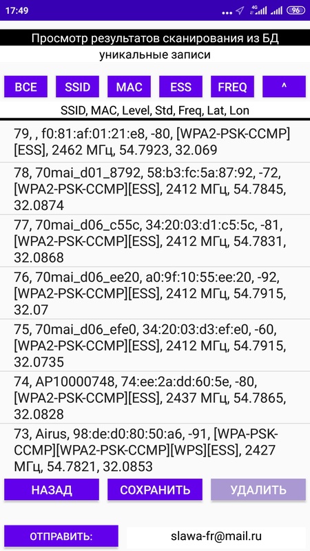 Может служить для определения открытых точек доступа в вашем городе. При сканировании WiFi сетей определяются их основные параметры. Открытые сети имеют ключ шифрования ESS. Вывод в окне просмотра используется для предварительного ознакомления. Анализ нужно будет проводить на компьютере с файлом, который сформирует данная программа: wifi.txt.