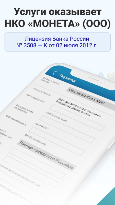 Услуги оказывает НКО «МОНЕТА» (ООО) Лицензия Банка России № 3508 — К от 02 июля 2012 г. Перевод осуществляется с помощью банковской карты VISA/MasterCard/МИР.