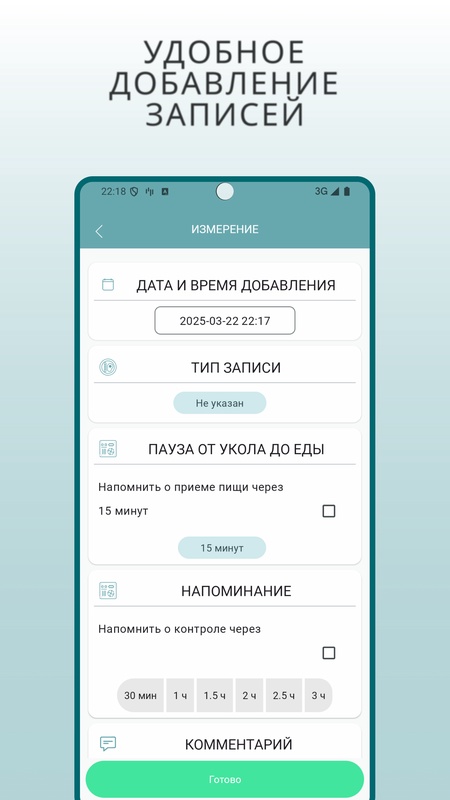 · Напоминания согреть инсулин, выпить таблетки, окончании паузы, контроля СК после еды и т.д.