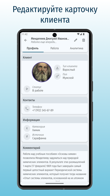 - Гибко настраиваемая карточка клиента с его контактами и информацией о нем.