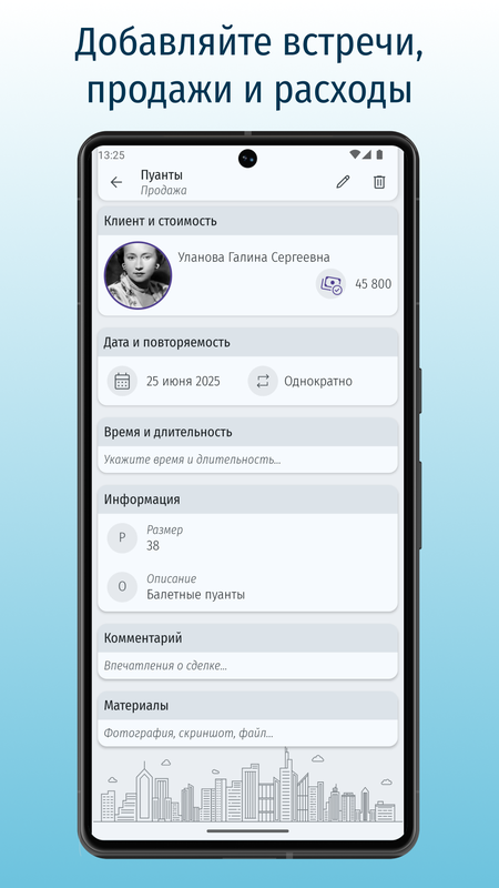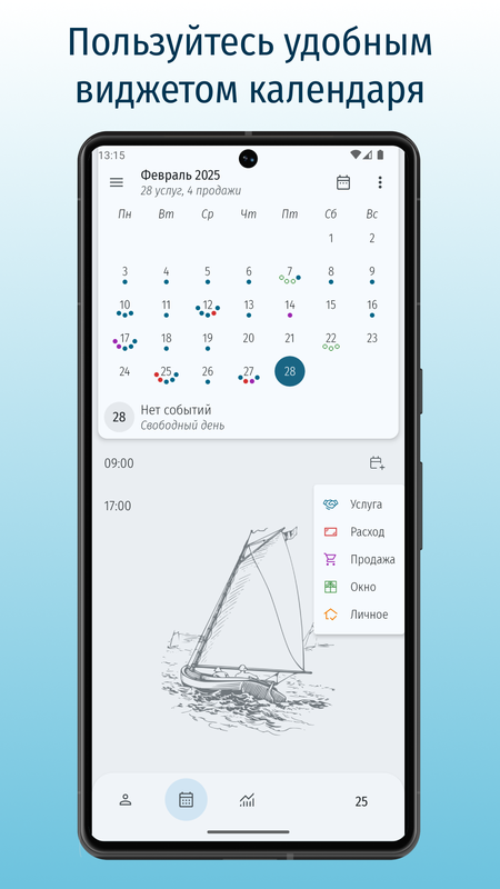 - Добавление и редактирование событий: встречи, продажи, расходы, свободные окна и личные дела.