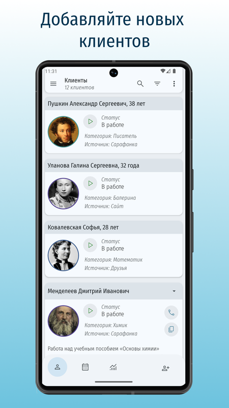 17 мая 2022, 07:14Добавьте деление, на категории клиентов. Уберите у взрослых клиентов имена родителей. Предложите сортировку по темам занятий. Приложение рабочее и хорошее рекомендую.