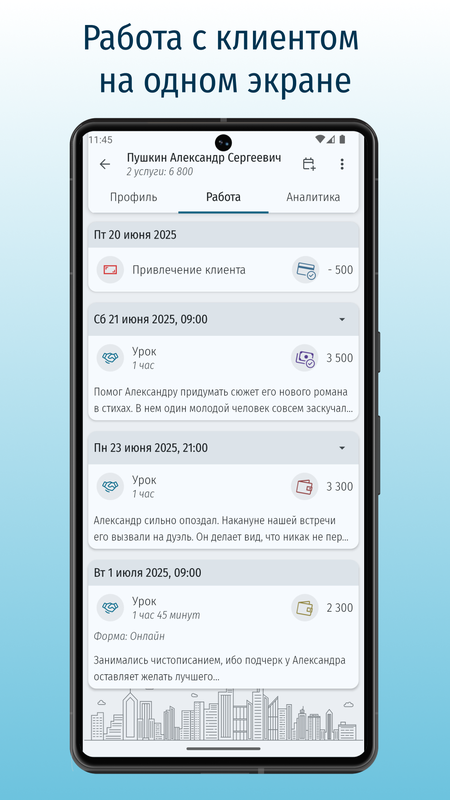 - Просмотр профиля клиента и работы, проводимой с ним, на одном экране.