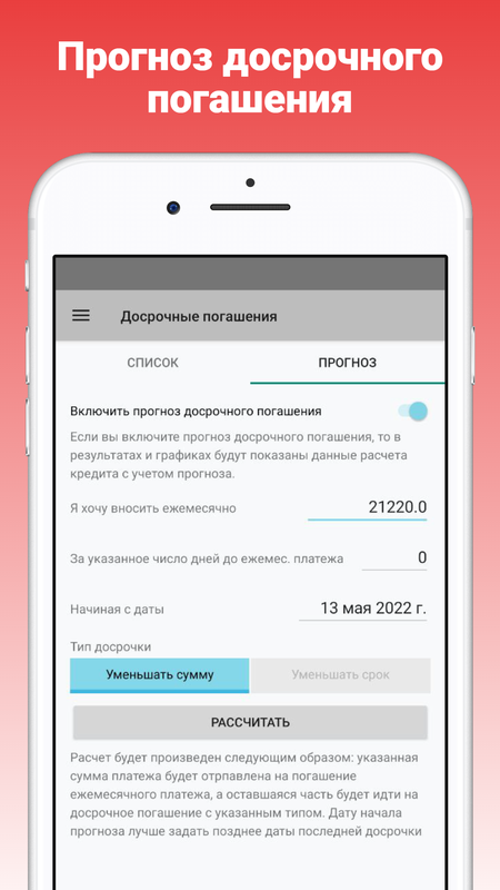 Для расчета потребуется ввести диапазон дат, указать сумму и тип досрочного погашения(уменьшение суммы платежа или уменьшение срока)