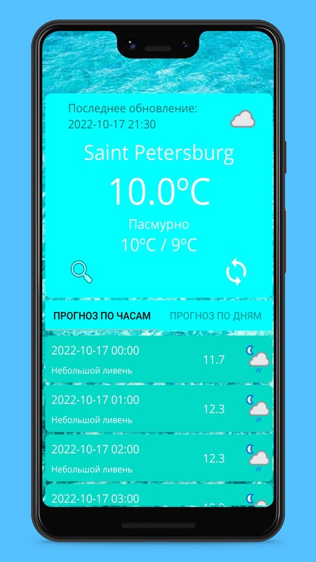 Простой прогноз погоды , с разбивкой по часам и по дням (на сегодня и два дня вперед). Приложение определяет геолокацию и выдает прогноз, можно через стороку поиска (вводить название города нужно только английскими буквами).