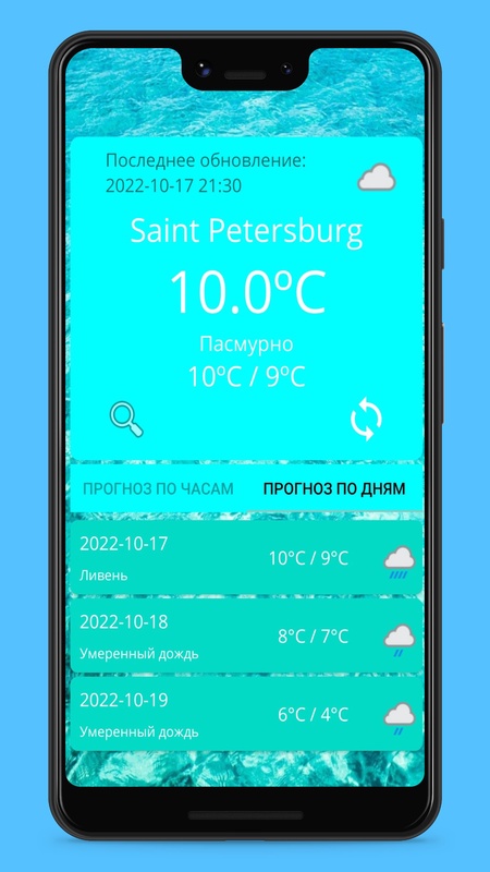 Простой прогноз погоды , с разбивкой по часам и по дням (на сегодня и два дня вперед). Приложение определяет геолокацию и выдает прогноз, можно через стороку поиска (вводить название города нужно только английскими буквами).