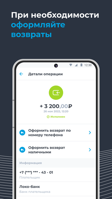 • при необходимости не только проводить платежные операции, но и осуществлять возврат средств клиентам как по безналичной системе, так и через кассу.