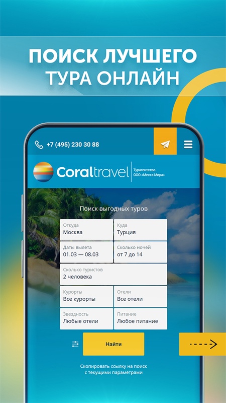 Настоящее приложение не является официальным приложением туроператора Coral Travel. Ответственность за содержание и любую информацию, размещенную в данном приложении, несет исключительно ООО "Места Мира"