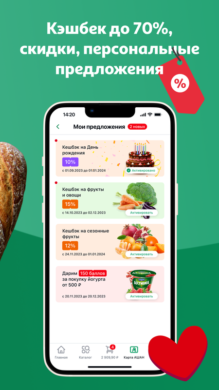 - Эксклюзивные 5% баллами за товары с фирменной птичкой АШАН