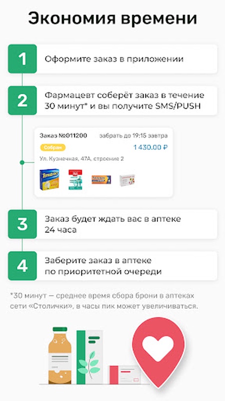 Заказывайте лекарства по единой НИЗКОЙ ЦЕНЕ в приложении сети социальных аптек Столички и забирайте их по приоритетной очереди уже через 30 минут в аптеке!