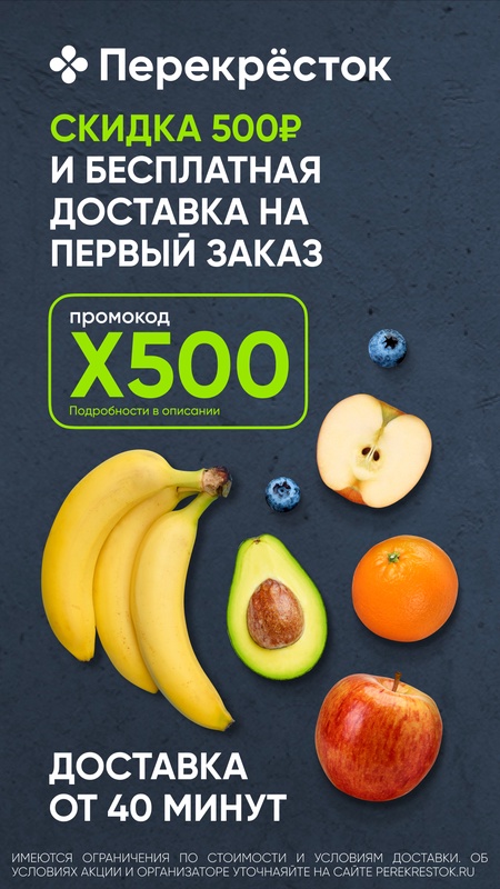 Скидка 500 рублей на первую покупку при заказе от 1500 рублей по промокоду X500. Промокод не действует на товары со скидкой и товары первой цены.