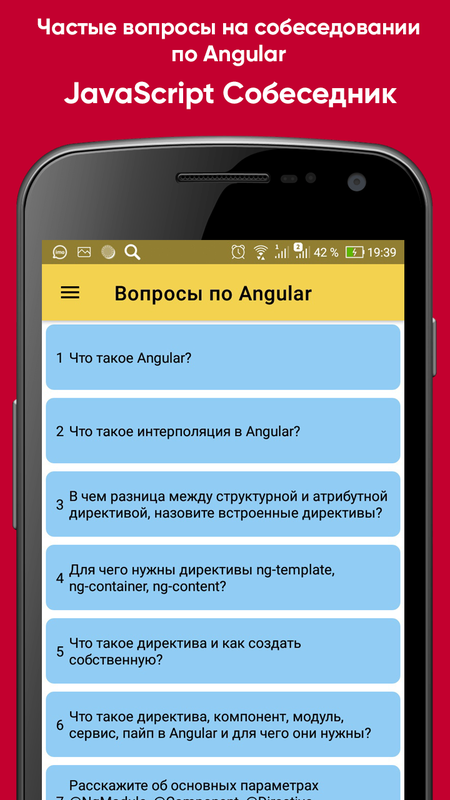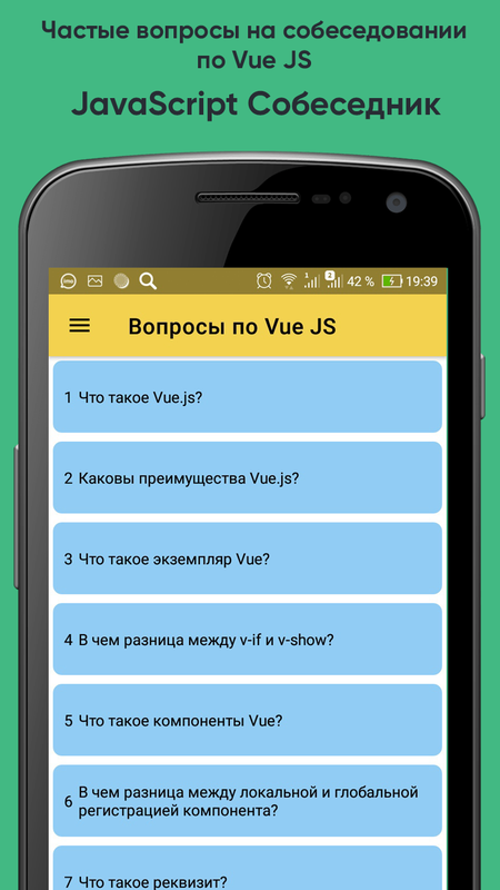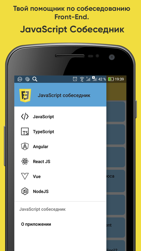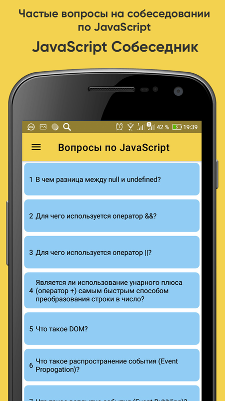В приложении собраны самые популярные вопросы по JS, Angular, React, Vue, NodeJS, TypeScript. Информация была собрана из открытых источников в сети интернет и официальной документации. Готовиться к собеседованию будет проще с приложением JavaScript собеседник.