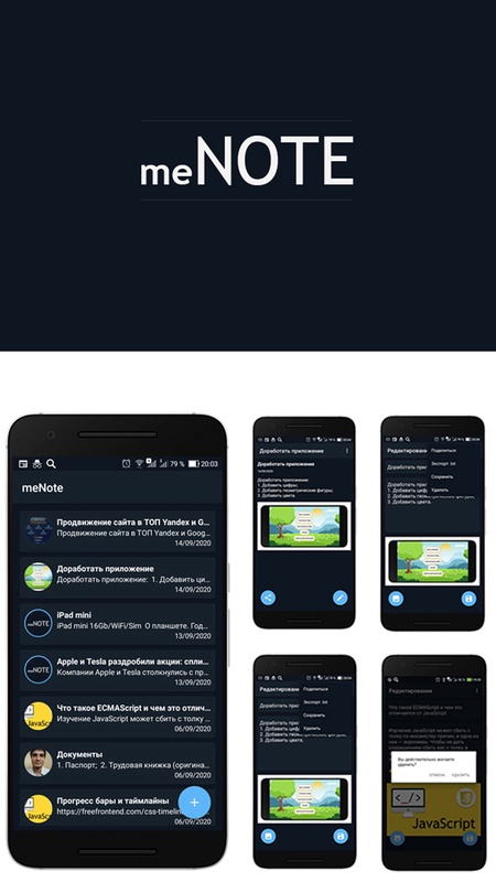 Блокнот meNote удобное приложение для ведения заметок. Интуитивно понятный интерфейс дает возможность легко и просто пользоваться блокнотом при создании / редактировании заметок, объявлений, email, сообщений, перечней дел, покупок и т.д.