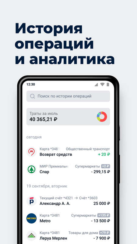 - Контролируйте свои расходы и поступления, начисление бонусов и кешбэка с помощью единой истории операций