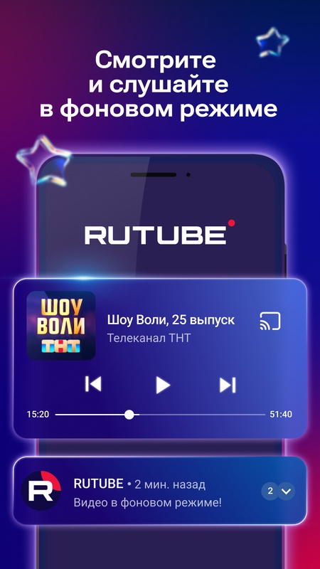 На RUTUBE есть все форматы контента: видео и трансляции блогеров, подкасты, прямые эфиры телеканалов, кино и сериалы, а также оригинальные шоу собственного производства. А главное — любой контент можно слушать в фоне, даже когда телефон заблокирован.
