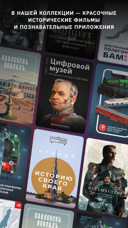 Цифровая коллекция ОАО «РЖД» — ваш путеводитель по прошлому, настоящему и будущему железных дорог России. Смотрите красочные исторические фильмы, пользуйтесь навигационными приложениями, изучайте культурно-просветительские проекты и открывайте историю великой страны. Коллекция постоянно пополняется.