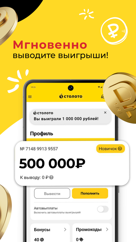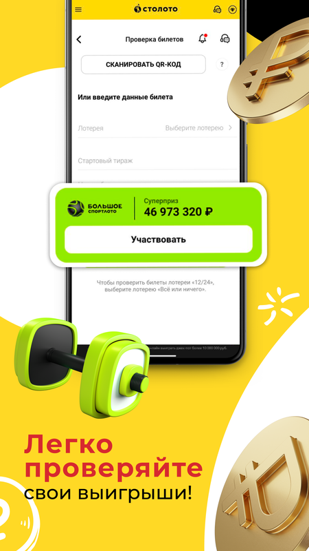 Государственная лотерея и национальная лотерея Столото — это не только шанс выиграть, но и возможность стать частью большой истории побед. Не упустите свой шанс! Скачайте приложение «Столото» и начните играть в лотереи на деньги уже сегодня. Ведь лотерея игра — это не только яркие эмоции, но и реальная возможность изменить свою жизнь!