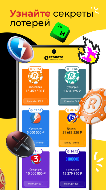 Приложение Столото — это 19 доступных лотерей в твоем смартфоне, среди которых культовая лотерея России Русское лото, а также государственная лотерея Спортлото и другие. Покупайте лото билеты, проверяйте результаты и выводите денежные выигрыши прямо в приложении — лотерея онлайн всегда под рукой.