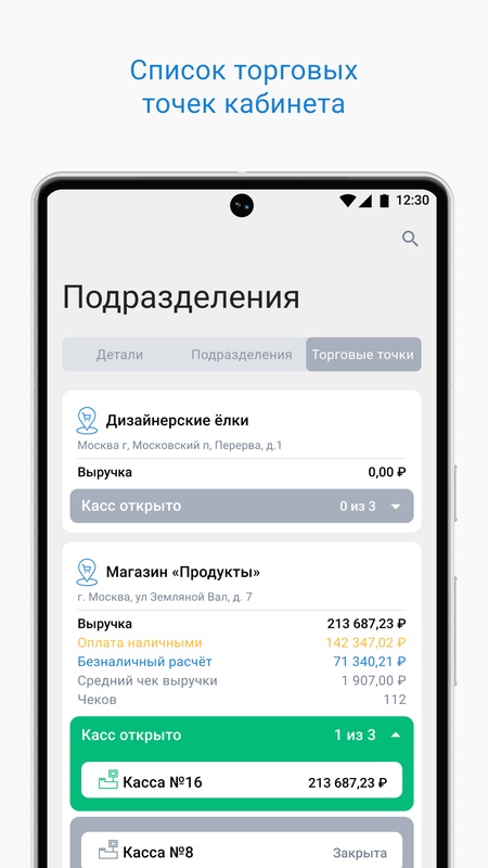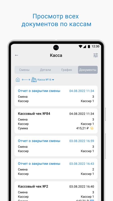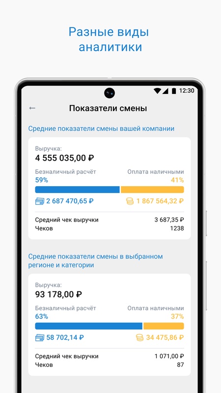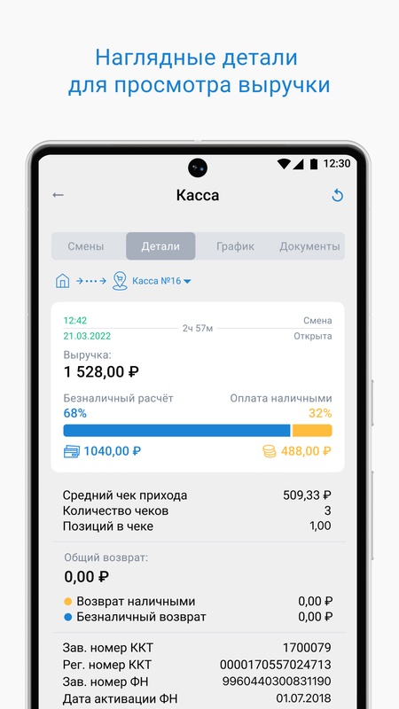 • Выручка по ККТ за смену, с разделением на наличный и безналичный расчет.